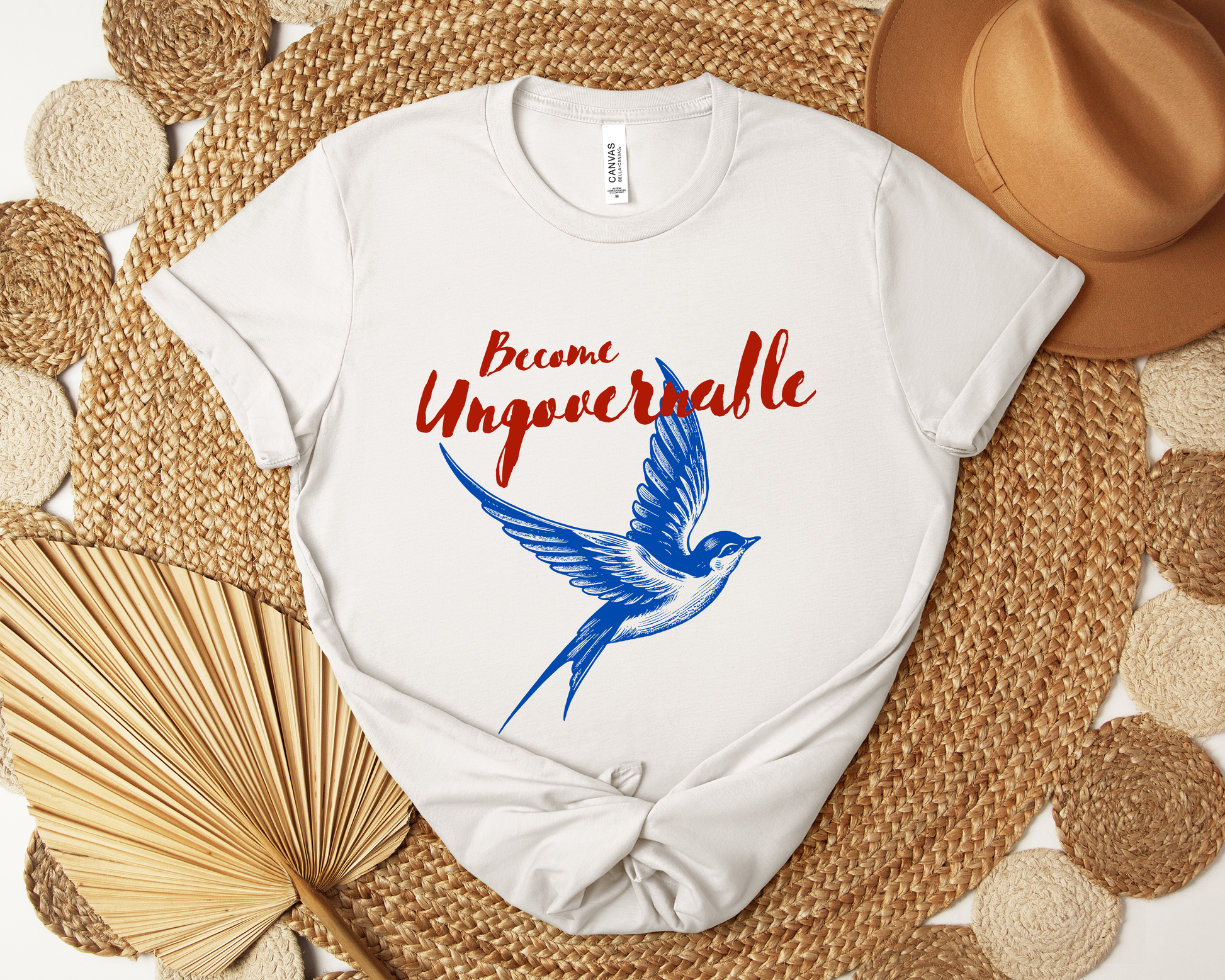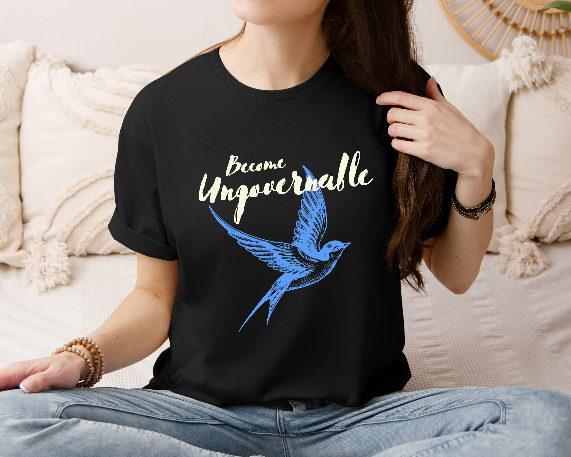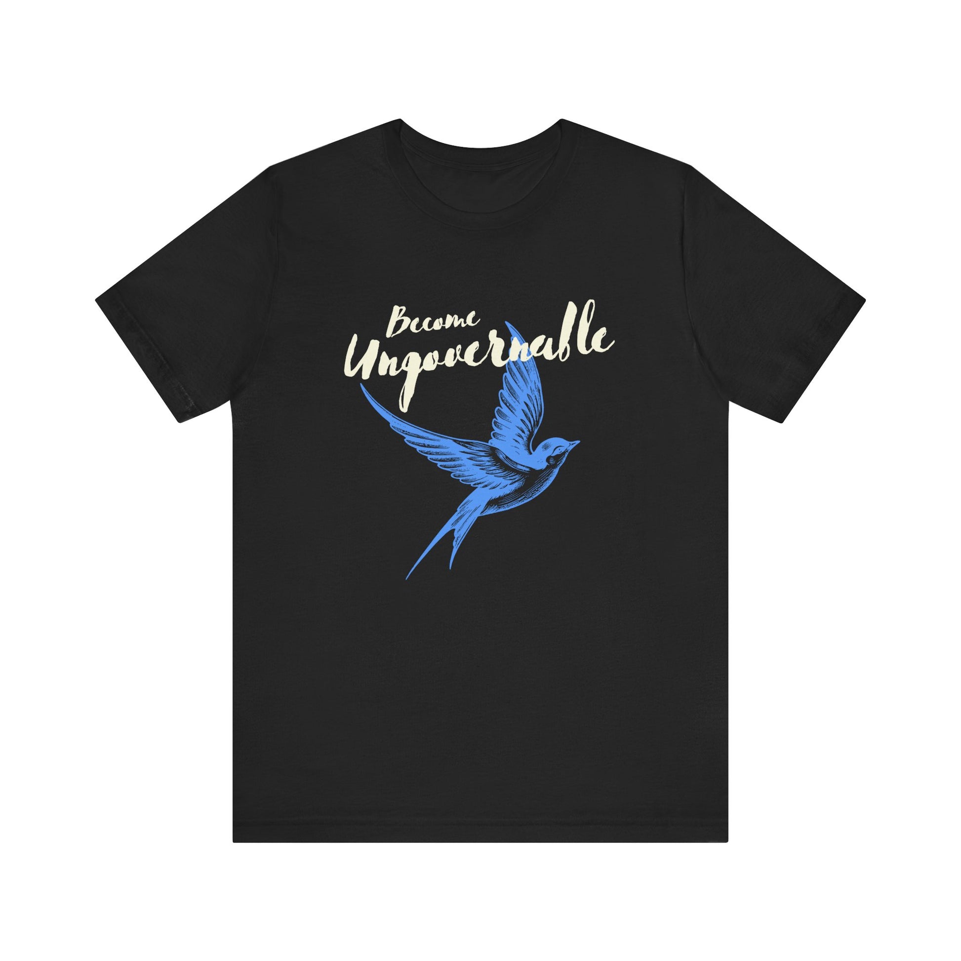 Make a bold statement with this "Become Ungovernable" graphic tee, featuring a vintage-style swallow bird illustration. Whether you’re passionate about activism, rebellion, or personal freedom, this shirt is perfect for those who challenge the status quo.