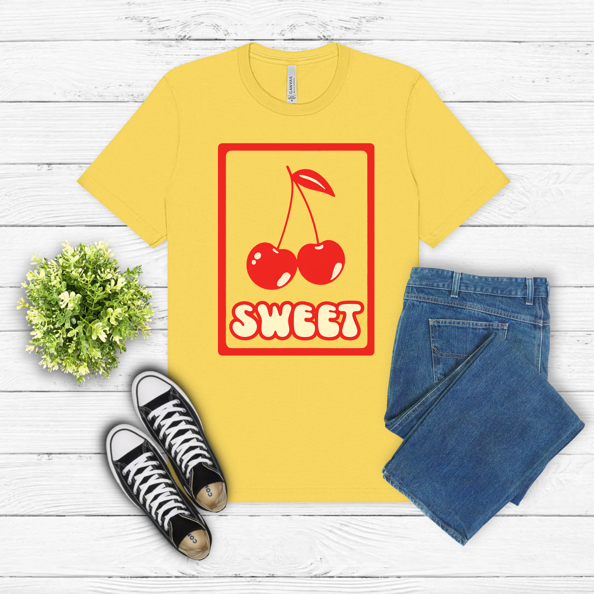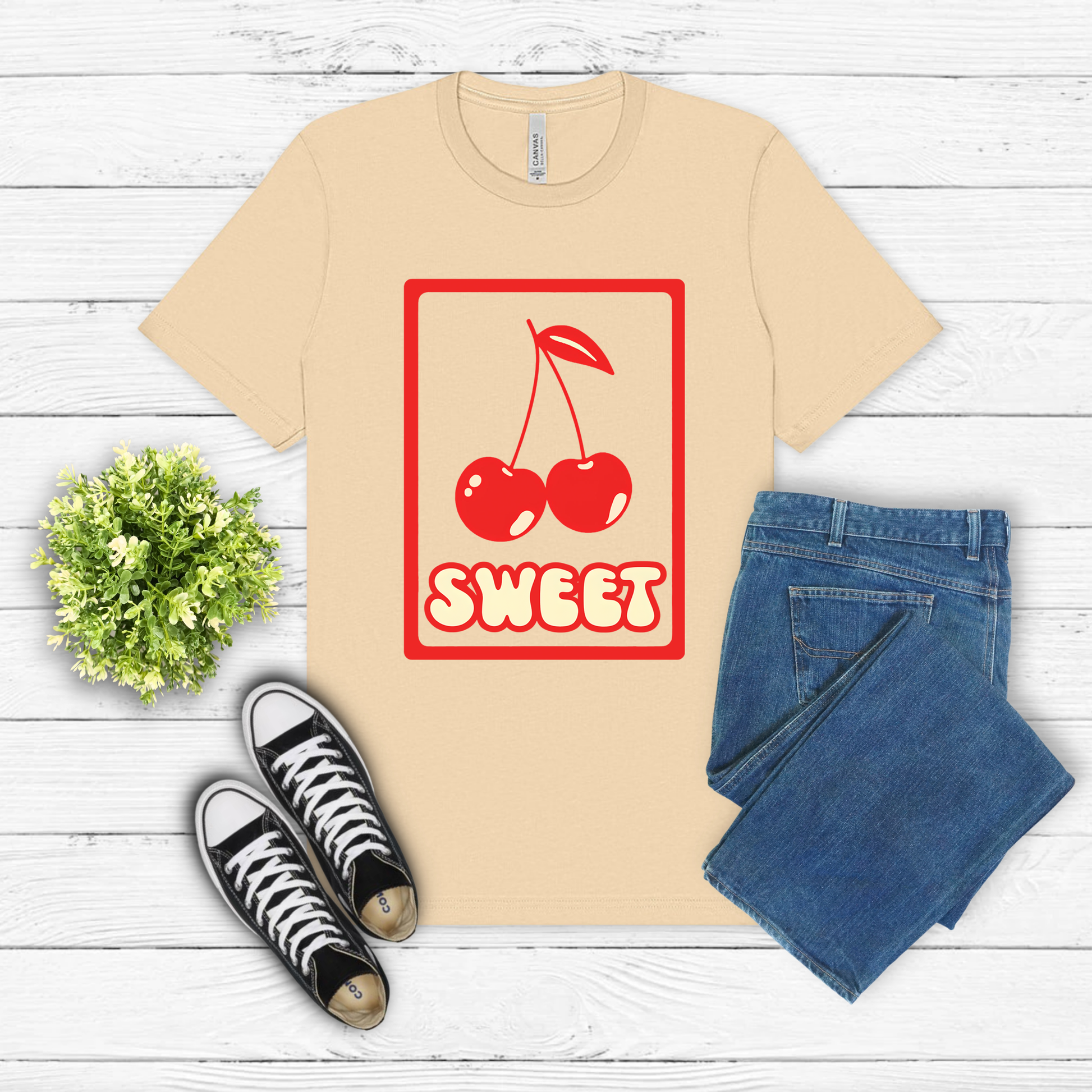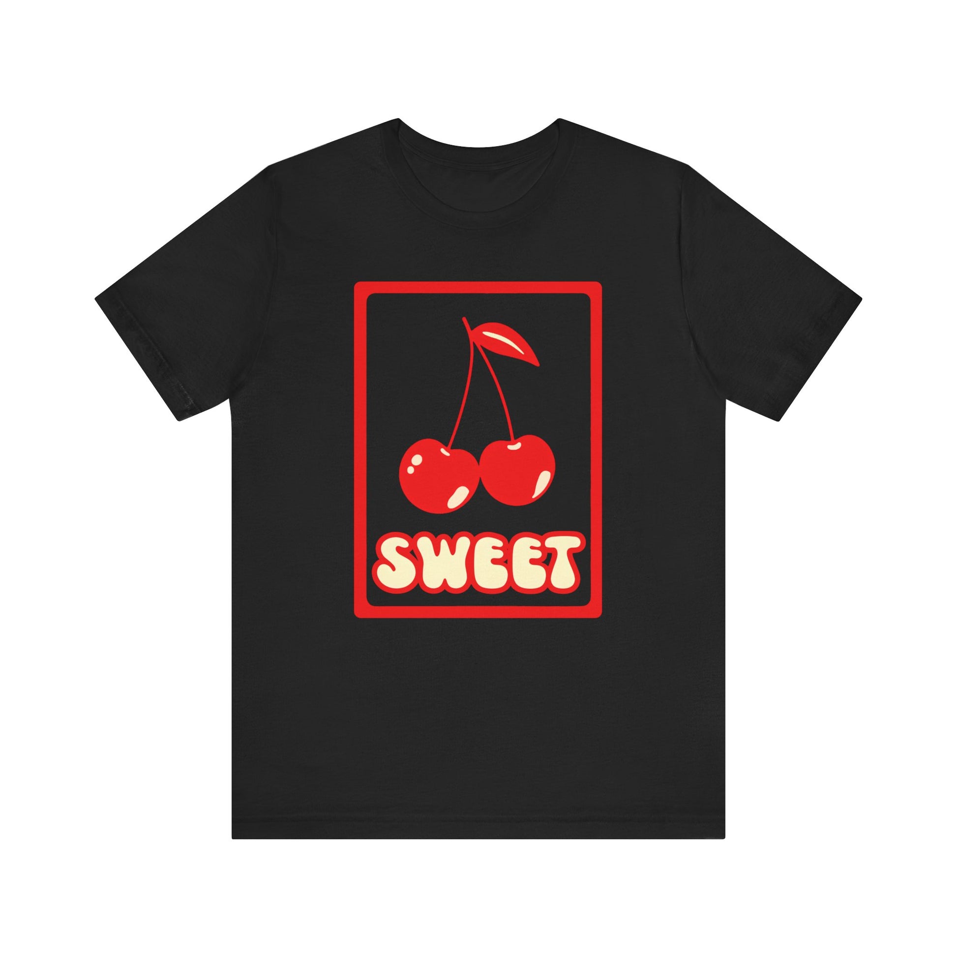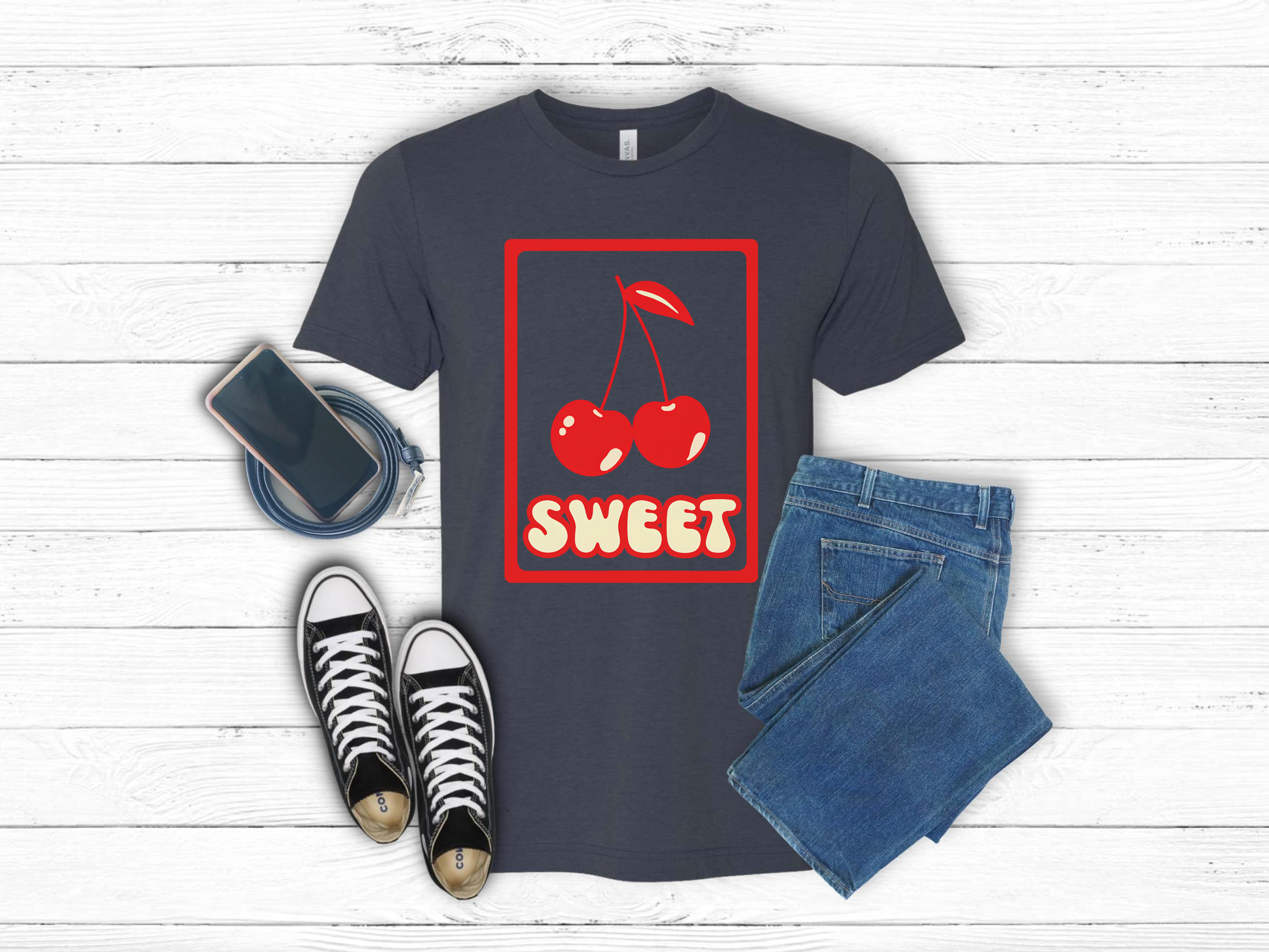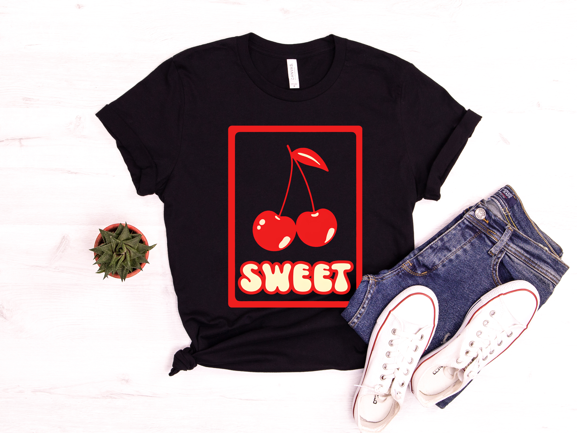 ✔ Bold cherry illustration with “SWEET” in retro block font