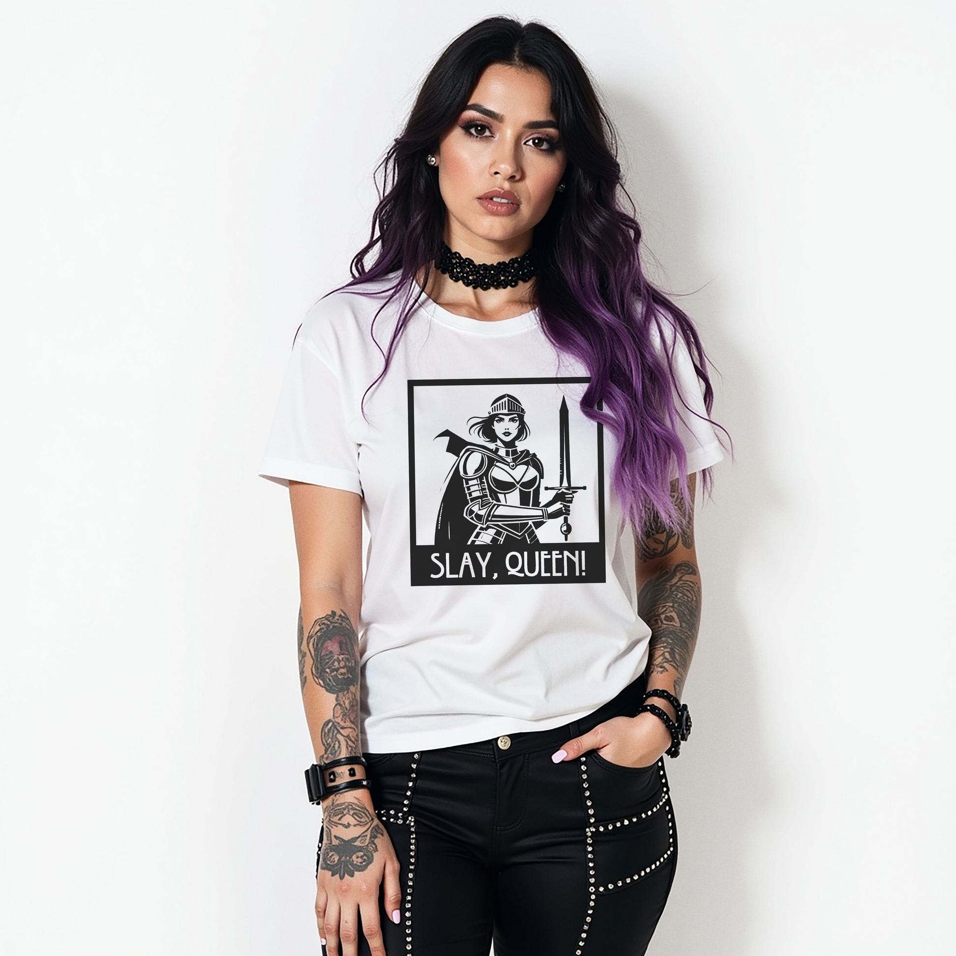 Whether you’re leading the charge, writing your own epic tale, or just reminding the world that you slay every single day, this shirt is made for warriors, rulers, and dreamers alike. Pick up your sword, stand your ground, and slay, Queen!
