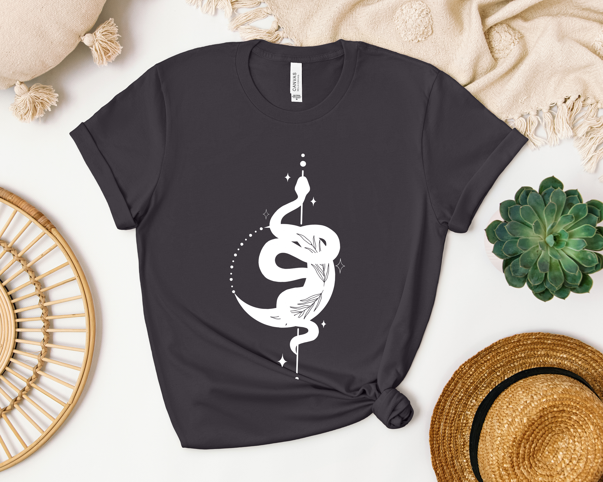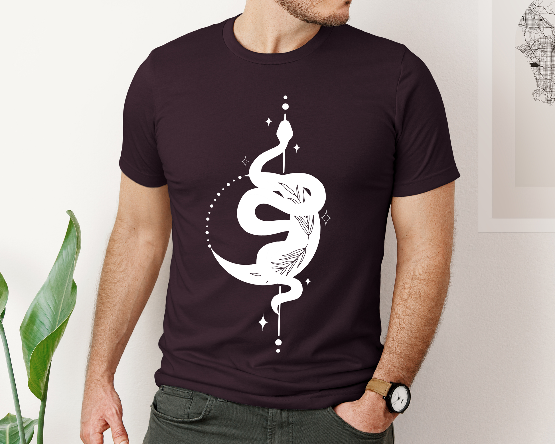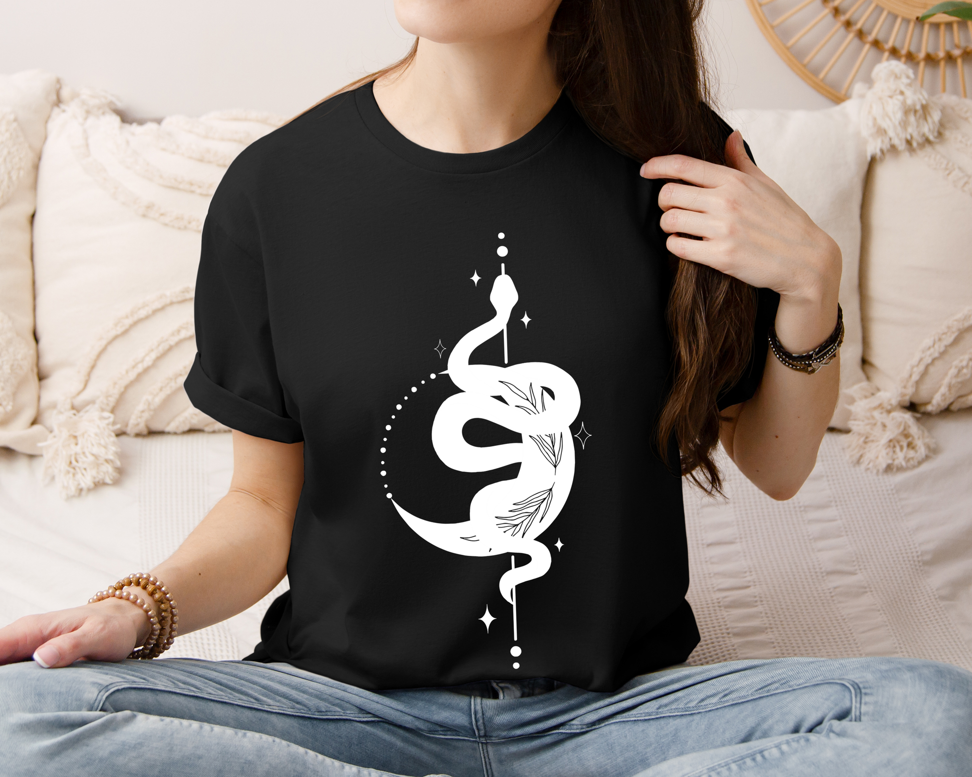 Sleek, mysterious, and effortlessly cool—this Moon and Snake t-shirt blends witchy aesthetics with a modern minimalist design. Featuring a stylized serpent wrapped around a crescent moon, this piece is perfect for those drawn to dark, celestial-inspired fashion with an edgy yet elegant feel.