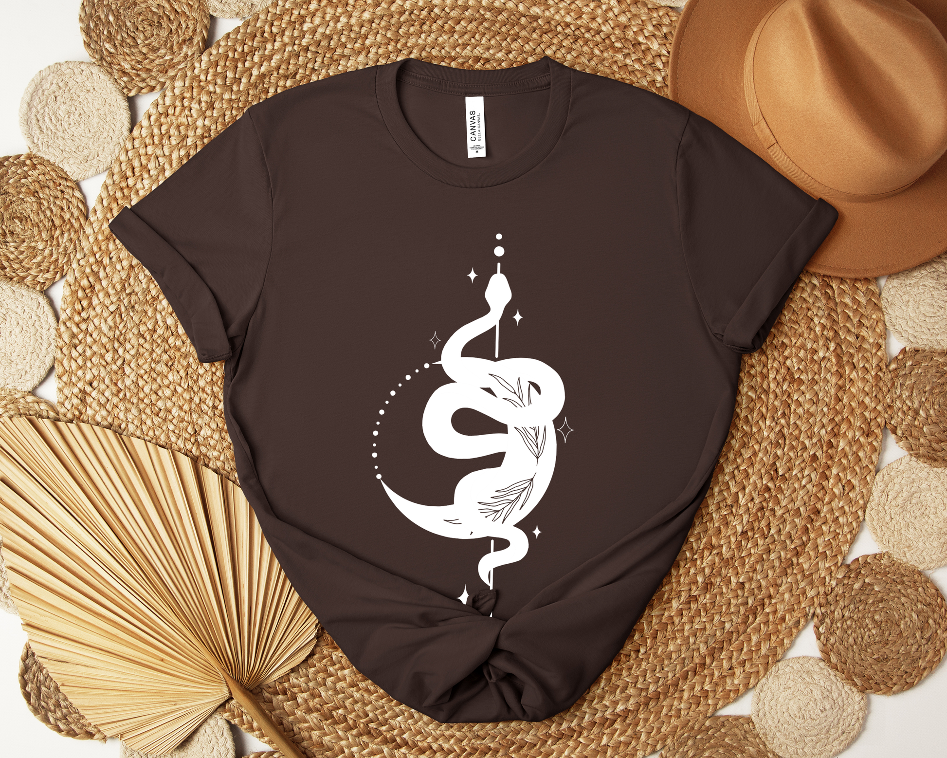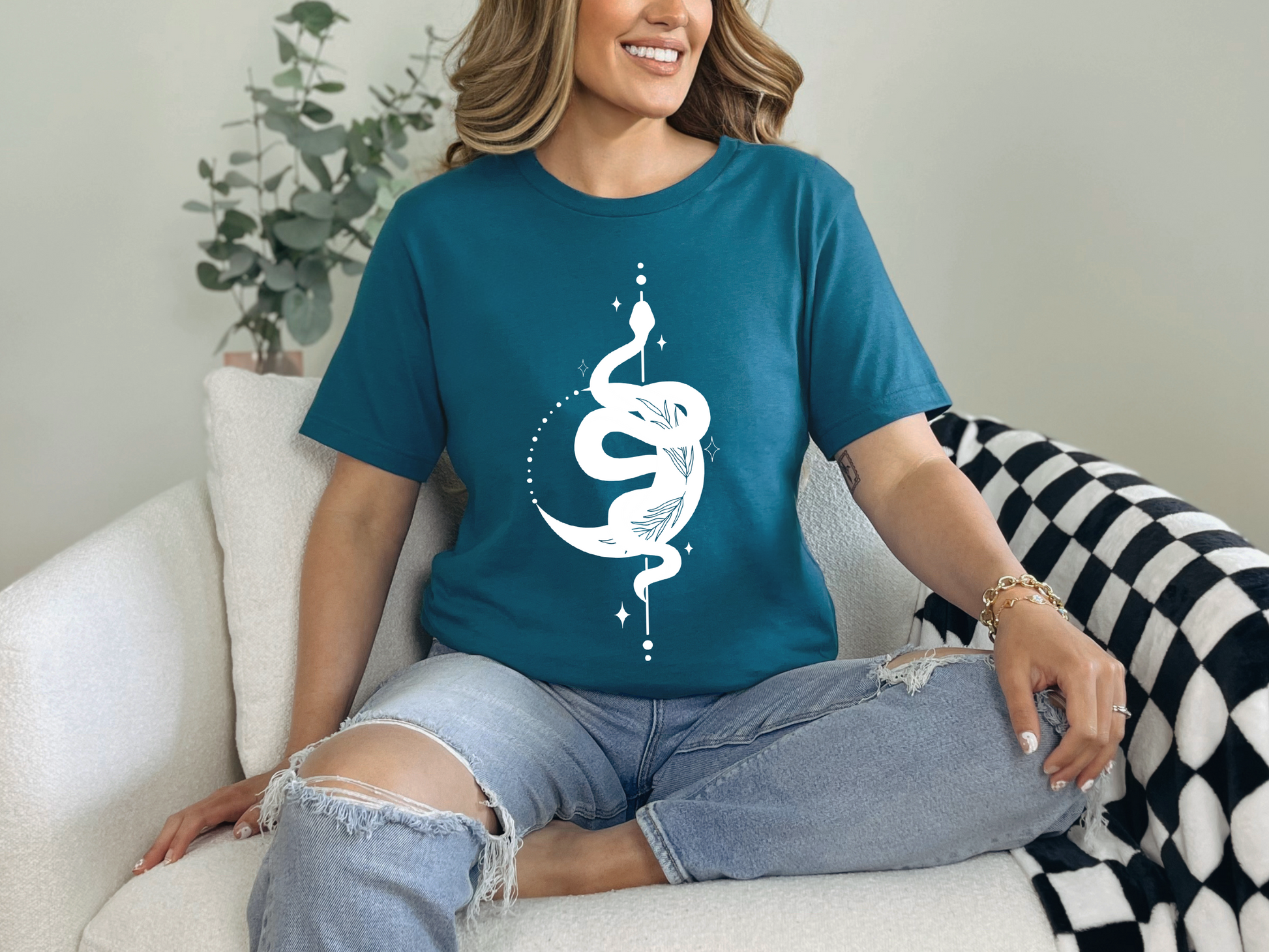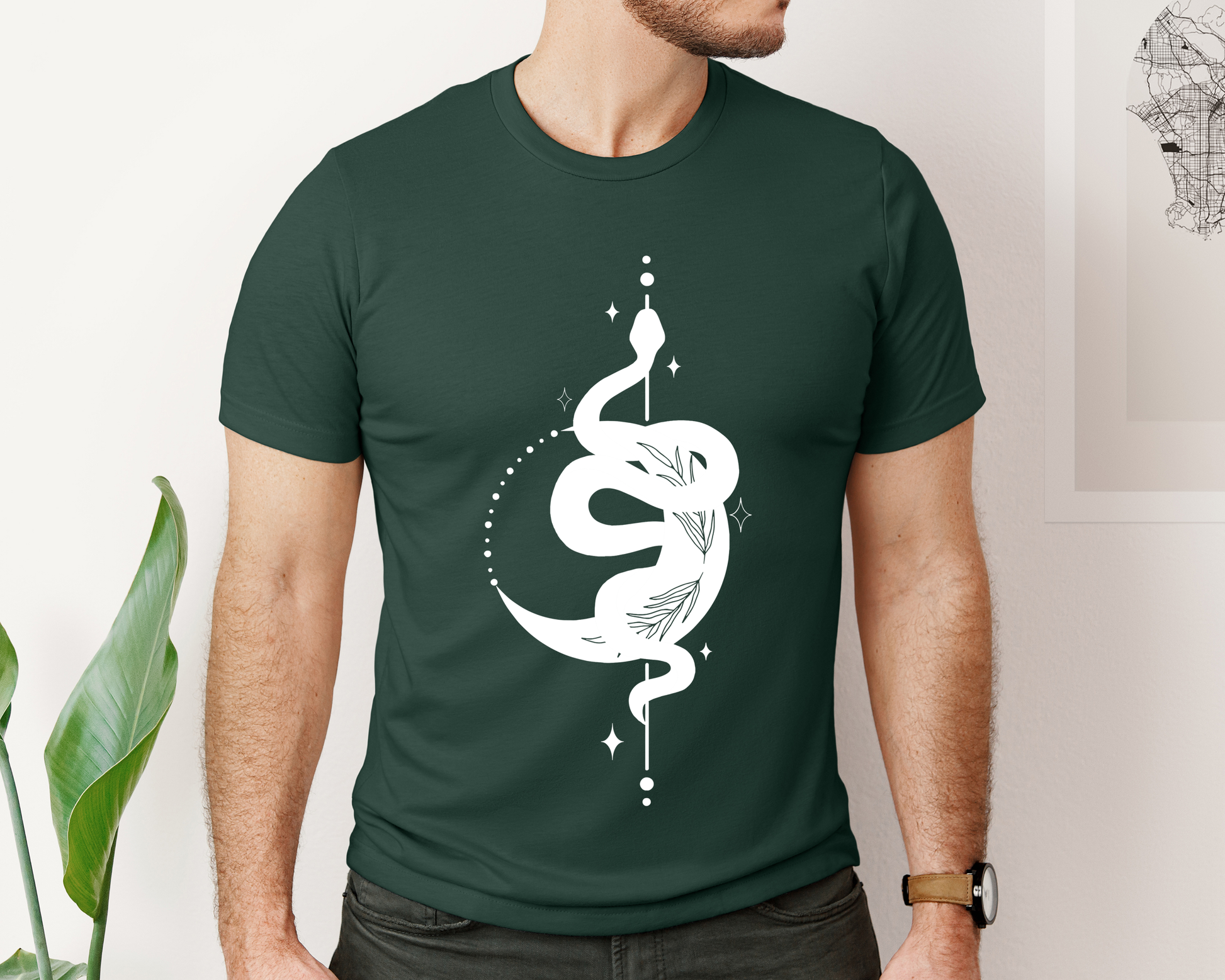Sleek, mysterious, and effortlessly cool—this Moon and Snake t-shirt blends witchy aesthetics with a modern minimalist design. Featuring a stylized serpent wrapped around a crescent moon, this piece is perfect for those drawn to dark, celestial-inspired fashion with an edgy yet elegant feel.