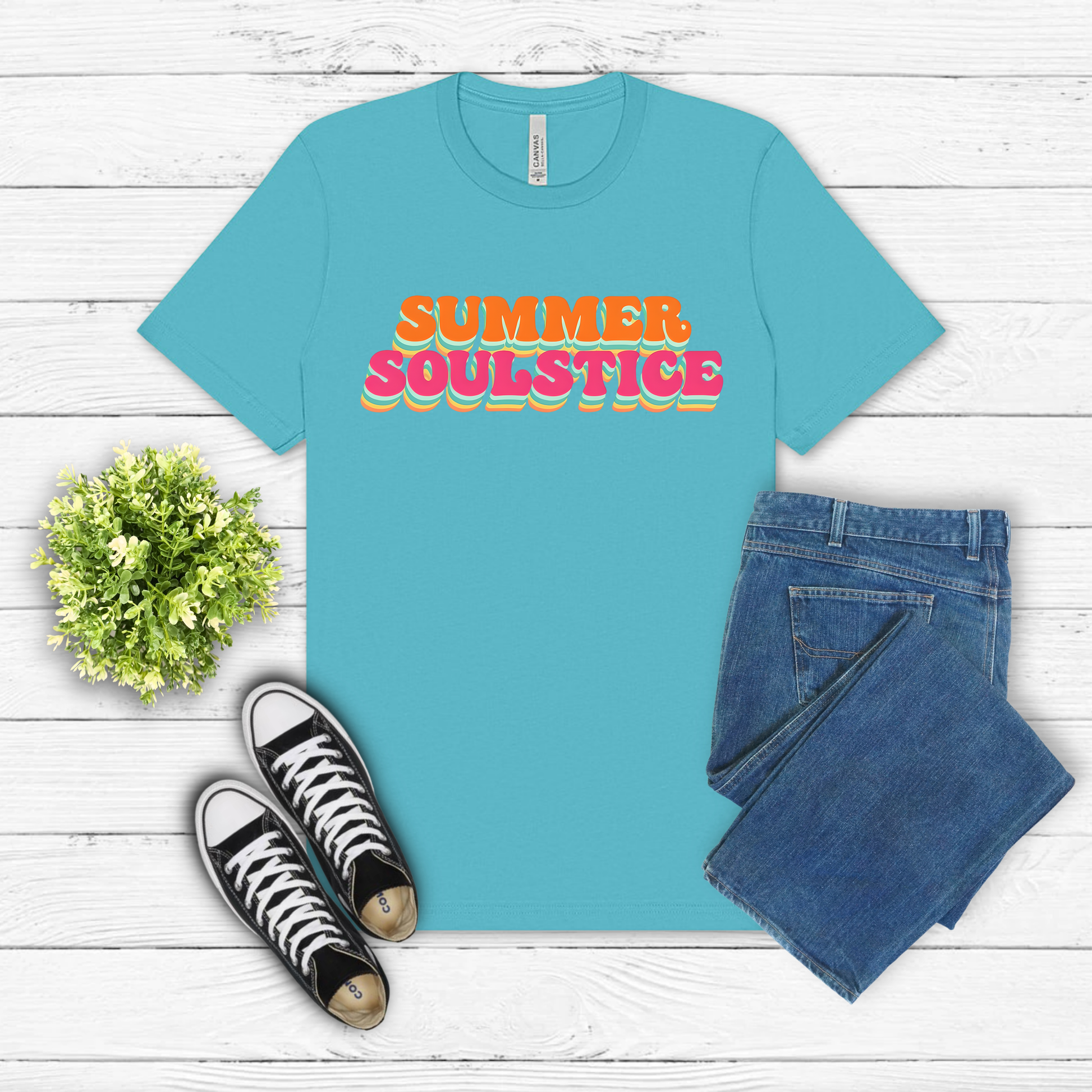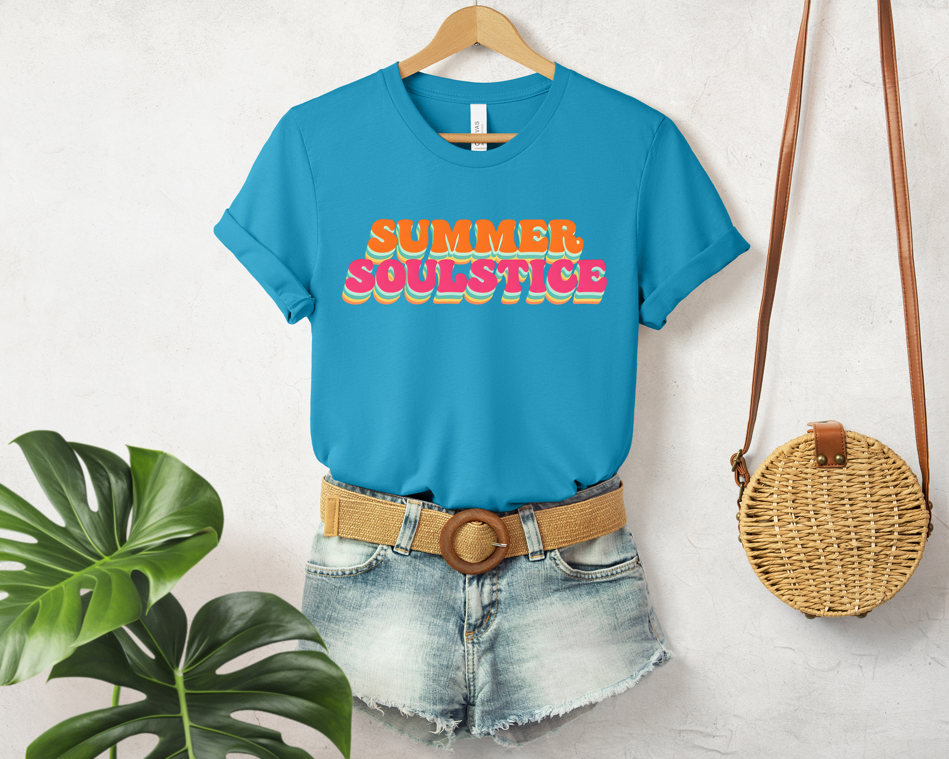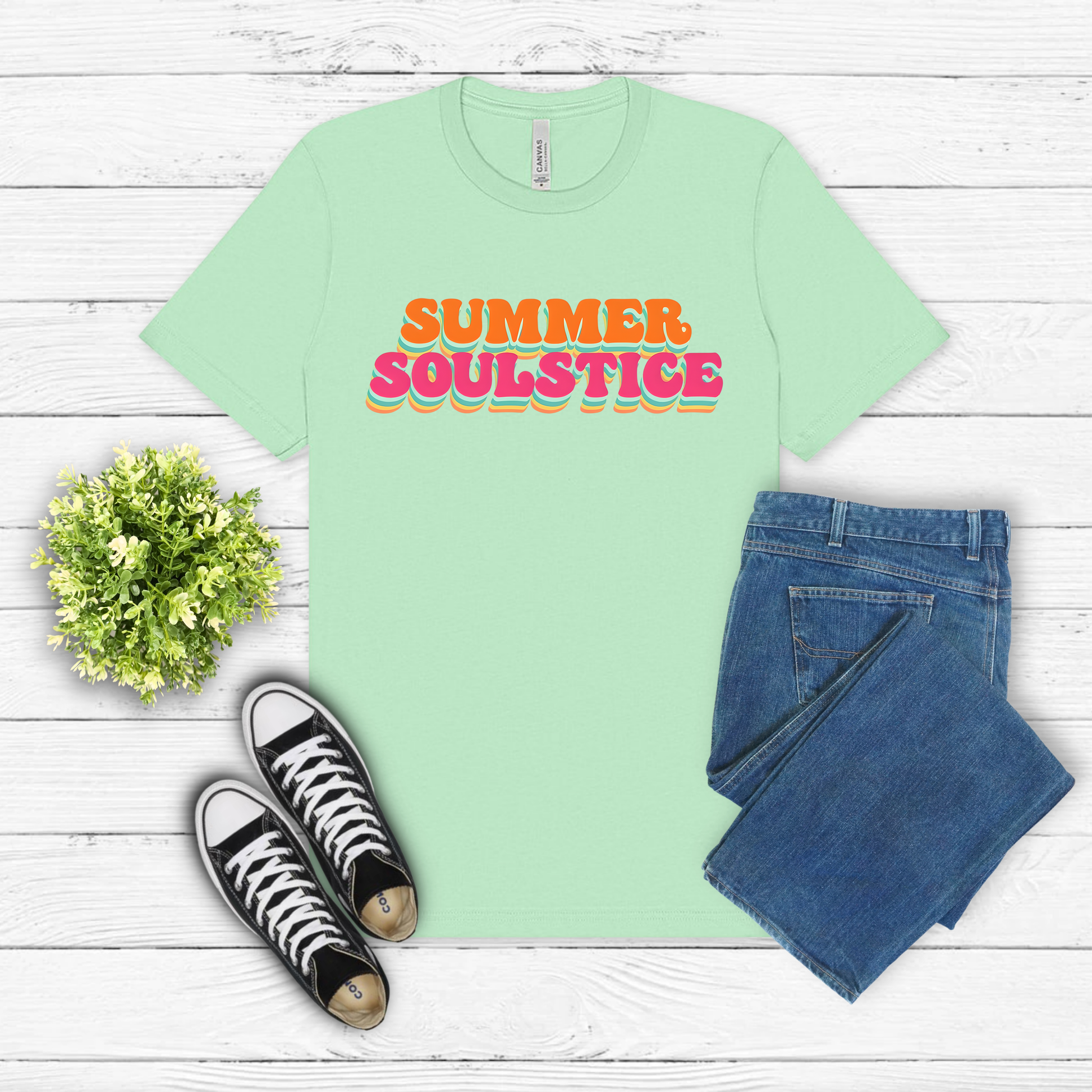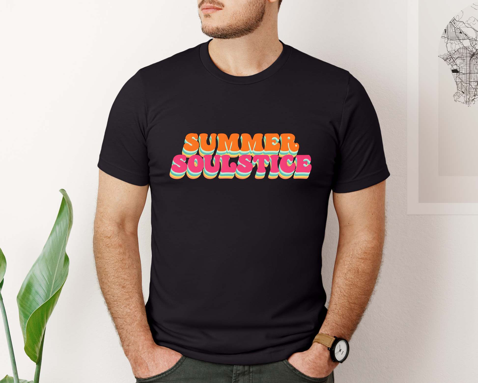 Summer Soulstice – Retro Groovy Sunshine Tee Bring the good vibes and golden rays with this “Summer Soulstice” t-shirt - a soulful spin on summer solstice with a vibrant retro twist. Featuring bold rainbow-stacked lettering and a funky 70s vibe, this tee is perfect for sun-chasers, soul-dancers, and anyone living for the season of color and connection.