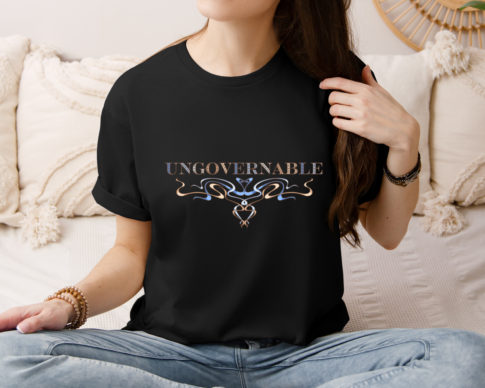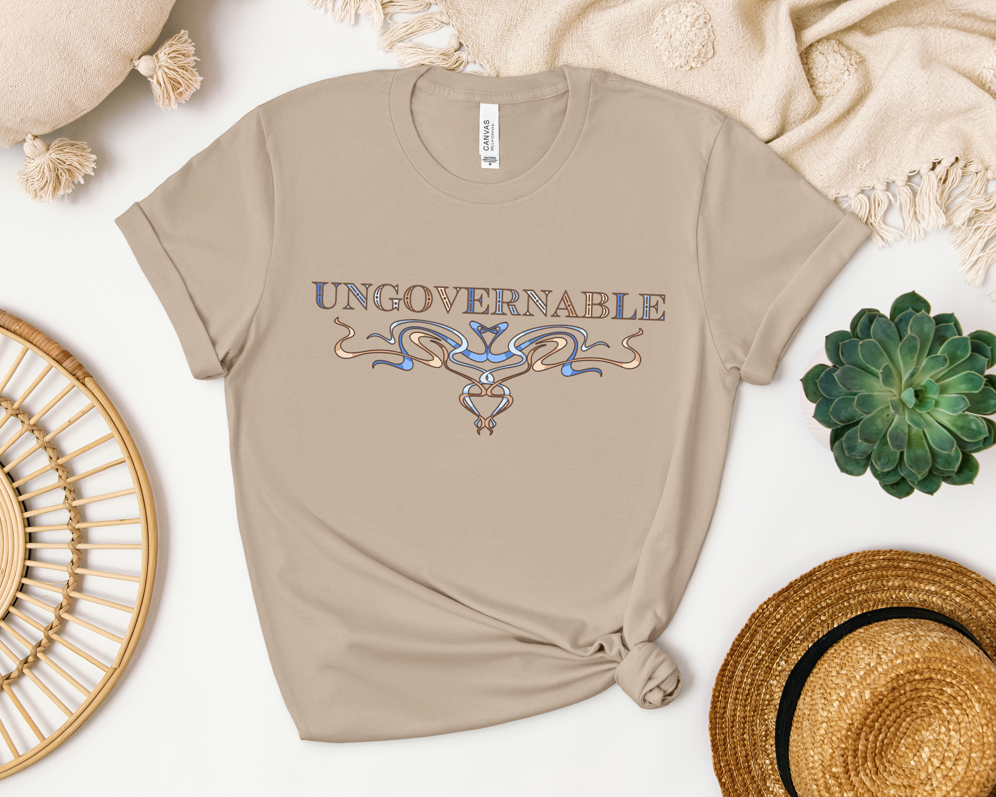 For the wild at heart, the fiercely independent, and the ones who refuse to be controlled—this “Ungovernable” t-shirt is for you. With its old-fashioned typography and swirling Art Nouveau-inspired design, this shirt blends rebellion with elegance, strength with whimsy. Whether you wear it as a statement of personal freedom, feminist empowerment, or a quiet act of resistance, this vintage-inspired tee is for those who make their own rules.